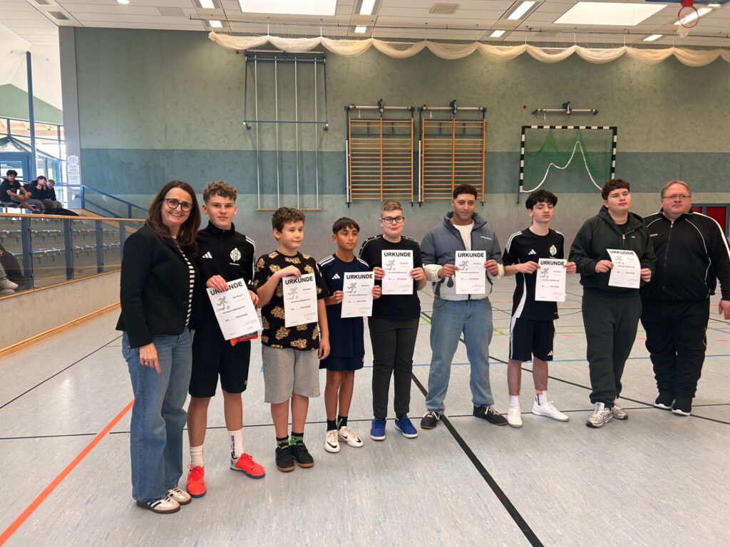 Keine einzige Niederlage musste unsere Schulmannschaft hinnehmen und ereichte mit einem Sieg und drei Unentschieden einen hervorragenden zweiten Platz. Zum ersten Mal kamen dabei auch unsere neuen Trikots zum Einsatz, die uns dankenswerter Weise die Firma Hennig gespendet hat.